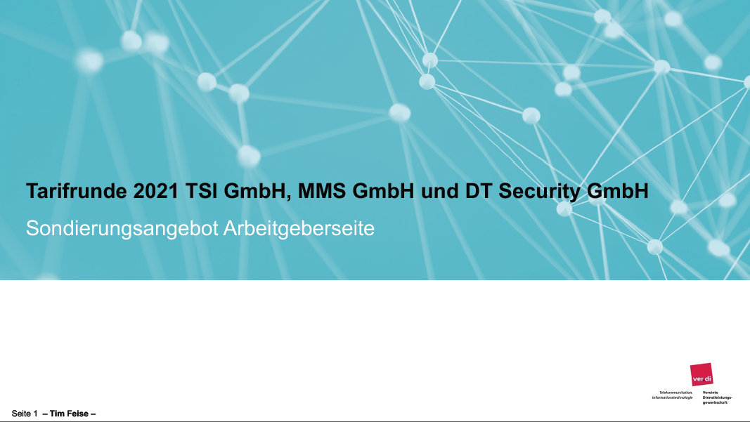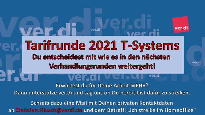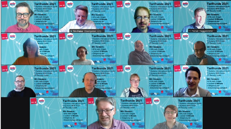 Am Freitag, den 29. Januar 2021 sind die Verhandlungen zur Tarifrunde 2021 für die ver.di-Mitglieder in der T-Systems International GmbH, der T-Systems MMS und der DT-Security aufgenommen worden. Coronabedingt wurden diese als Webkonferenz durchgeführt.